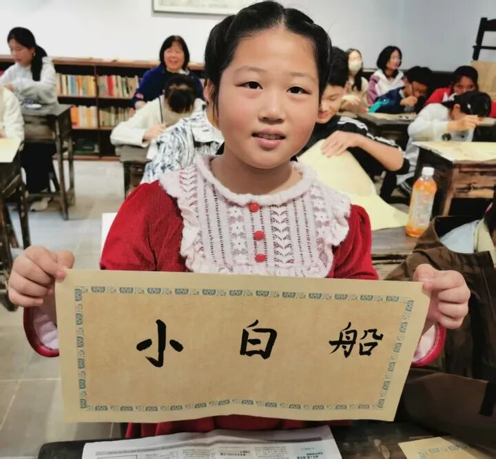 《小白船》《稻草人》《一粒种子》《快乐的人》《三棵银杏树》《多收了三五斗》……近日,一场书法体验活动正在甪直叶圣陶纪念馆举行,来自甪直星泽实验学校的二十余名学生在书法老师姚伟香的带领下走进叶圣陶纪念馆体验教室,书写叶圣陶先生的经典作品名,一横一竖彰显对先生的敬仰,一撇一捺体现对文化的传承。“我跟着姚老师学习了一段时间,掌握了一些笔法。”四年级学生魏子涵娴熟地用正楷写好“小白船”三个字,“《小白船》是叶圣陶的首篇童话作品,也是一篇流传至今的经典幼儿文学作品,我非常喜欢。”现场,其他小学生也分别书写了自己喜爱的作品名称。
