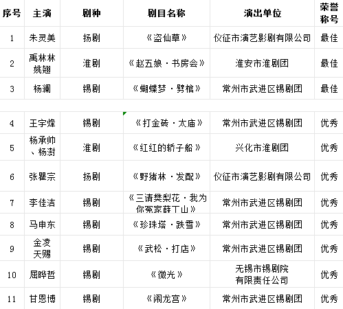 经过戏剧专家的专业评审,阜阳市委宣传部纪检小组全程监督参与,共推选出58个“最佳”荣誉称号,106个“优秀”荣誉称号。其中我省获得8个“最佳”荣誉称号(器乐1个、小戏3个、演唱4个),18个“优秀”荣誉称号(小戏8个、演唱10个)。