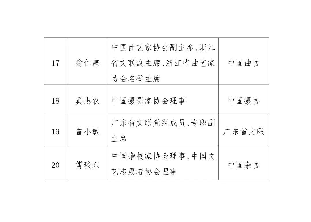 为了积极培育和践行社会主义核心价值观,大力弘扬“奉献、友爱、互助、进步”志愿精神,培育志愿文化,发挥文艺志愿者先进典型示范引领作用,引导全社会向先进典型学精神、学品质、学方法,推动形成崇尚先进、见贤思齐的浓厚氛围,经中央宣传部批准,中国文联首次开展了2025年度“‘时代风尚’文艺志愿者”宣传选树活动。经中国文联各团体会员推荐、专家推选、社会公示等环节,推选出2025年度“时代风尚”文艺志愿者20人,现予以公布。