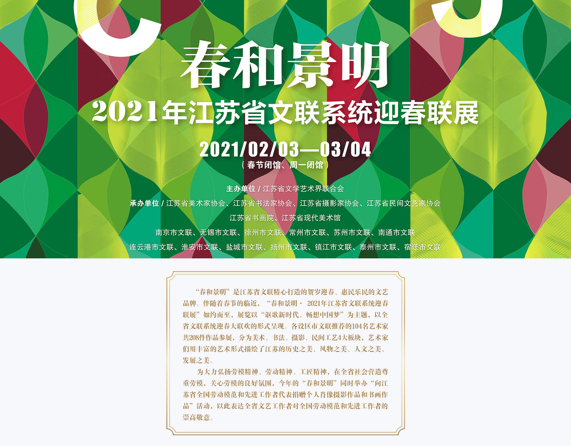 “春和景明”是江苏省文联精心打造的贺岁迎春、惠民乐民的文艺品牌。伴随着春节的临近,“春和景明· 2021年江苏省文联系统迎春联展”如约而至,展览以“讴歌新时代、畅想中国梦”为主题,以全省文联系统迎春大联欢的形式呈现。