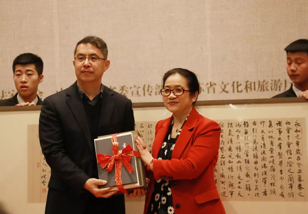 孙晓云向国家博物馆赠送书法作品和作品集,国家博物馆副馆长陈成军接受捐赠并颁发收藏证书。