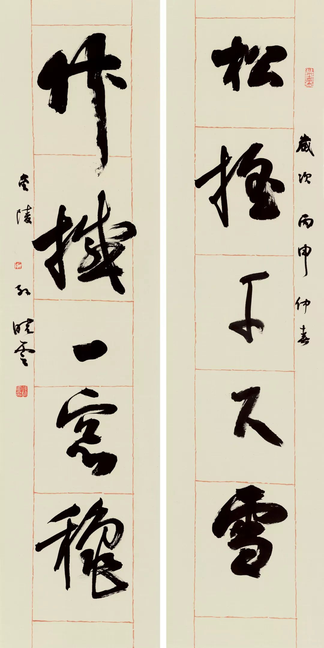《松摇千尺雪 竹撼一窗秋》 134cmX33cmX2 2016年