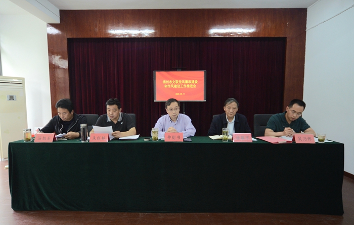 在“5·10”扬州市第十一个党风廉政教育日到来之际,为贯彻落实全市服务高质量发展作风建设大会精神和市纪委七届五次全会精神,5月11日下午,市文联组织召开党风廉政建设和作风建设工作推进会。会议由市文联党组成员、副主席吴乃怀主持。会上,市文联党组成员、副主席朱红林向大家传达了市纪委七届五次全会精神,市文联党支部书记吴乃怀向市文联党组递交了《扬州市文联2020年机关党建工作责任状》,市文联党组书记、主席仲衍书,市纪委监委第六派驻纪检监察组组长徐朝平出席会议并讲话。会议还集中观看了第四届“清廉中国·微视频”展播作品《一念之间》。