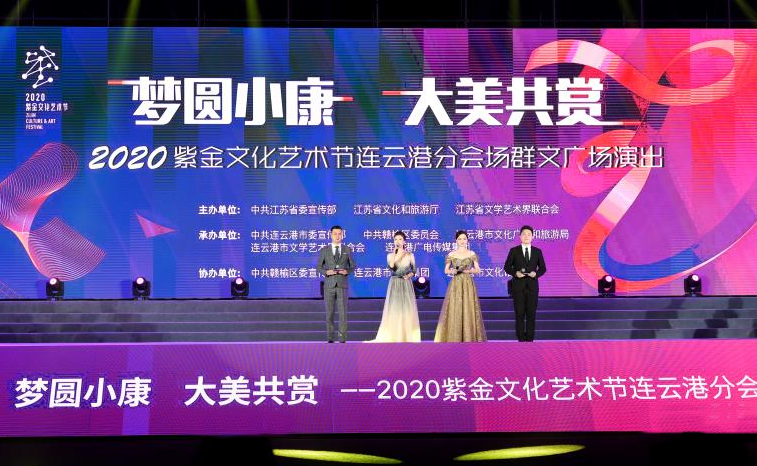 10月18日晚,“梦圆小康 大美共赏”2020紫金文化艺术节连云港分会场群文广场演出在赣榆区新时代文明实践中心精彩上演。省委宣传部副部长徐宁、市委常委、宣传部部长滕雯、市政府副市长陈书军,本届紫金文化艺术节评审组专家,赣榆区四套班子主要负责同志,全市宣传文化系统各单位负责同志,以及现场4000多名赣榆的观众共同观看演出。