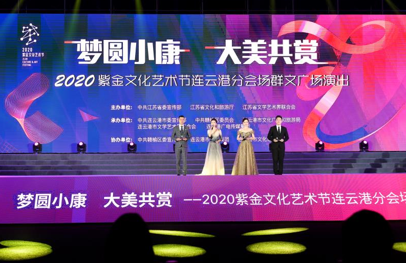10月18日晚,“梦圆小康 大美共赏”2020紫金文化艺术节连云港分会场群文广场演出在赣榆区新时代文明实践中心精彩上演。省委宣传部副部长徐宁、市委常委、宣传部部长滕雯、市政府副市长陈书军,本届紫金文化艺术节评审组专家,赣榆区四套班子主要负责同志,全市宣传文化系统各单位负责同志,以及现场4000多名赣榆的观众共同观看演出。