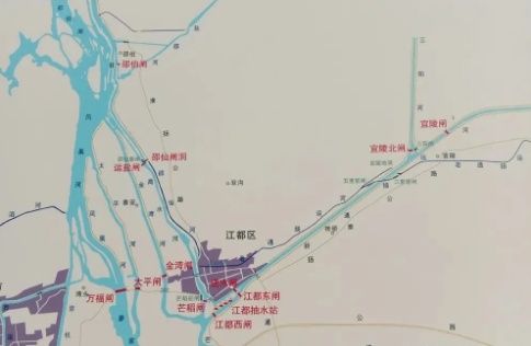 江都水利枢纽的北面是芒稻河和新通扬运河,芒稻河直通长江,新通扬运河则直通里下河腹地,与苏北河网联通,两条河流连接处设有东、西两座闸。当雨量较大时,东闸开启,抽水站就可以通过通扬运河,把北边多余的水抽到长江内;而当雨量减少,天气干旱时,西闸开放,便可将长江水送到北边去。如此,江淮两川从此跨流域互调,并通过8级提水站,将水直送徐淮地区和洪泽湖畔的安徽毗邻地区,直接灌溉360多万亩农田。