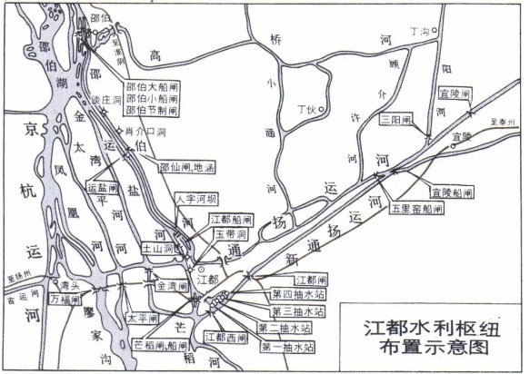 1980年5月,江都水利枢纽工程,除新通扬运河段和三阳河续建工程以及江都西闸加固工程外,整个工程基本完成。枢纽的配套建筑物有运盐闸、芒稻闸和船闸、江都西闸及东闸、送水闸、邵仙闸洞、五里窑船闸、宜陵闸及船闸、江都船闸、宜陵北闸、宜陵地下涵洞等13座建筑物。