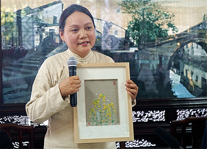 此次捐赠给苏州市援湖北医疗队员们的《油菜花开》系列作品,以“邹式滴滴针法”为主要针法,结合打籽绣和古老的捻线工艺,历时3个月制作而成。