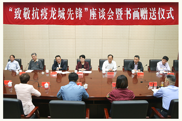 5月9日上午,由中共常州市委组织部、常州市文联联合举办的“致敬抗疫龙城先锋”座谈会暨书画赠送仪式在常州市行政中心高远厅举行,常州市书画家创作的130件书画作品赠予奋战在疫情防控一线的先锋模范,向他们表达崇高敬意。常州市委组织部副部长、党建办主任、两新工委书记安春燕,常州市文联党组书记、主席黄建德,“抗疫龙城先锋”及艺术家代表参加赠送仪式。