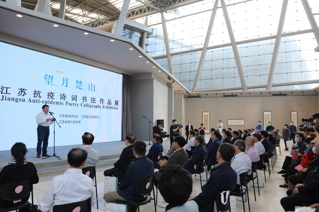 5月11日上午,由江苏省诗词协会、江苏省书法家协会联合主办的“望月楚山·江苏抗疫诗词书法展”在江苏省现代美术馆开展。江苏省委原书记梁保华,全国人大提案委员会副主任蒋定之,江苏省委常委、宣传部长王燕文,老领导顾浩、任彦申、冯敏刚、俞兴德、柏苏宁、张九汉,省文联主席章剑华,省文联党组书记、常务副主席、书记处第一书记水家跃,省作协党组书记汪兴国,省文联党组成员、副主席、书记处书记王建等有关领导出席开展仪式。江苏省委组织部原副部长、省委党建办原主任、江苏省诗词协会常务副会长盛克勤,中国书协副主席、江苏省书协主席孙晓云在仪式上致辞。