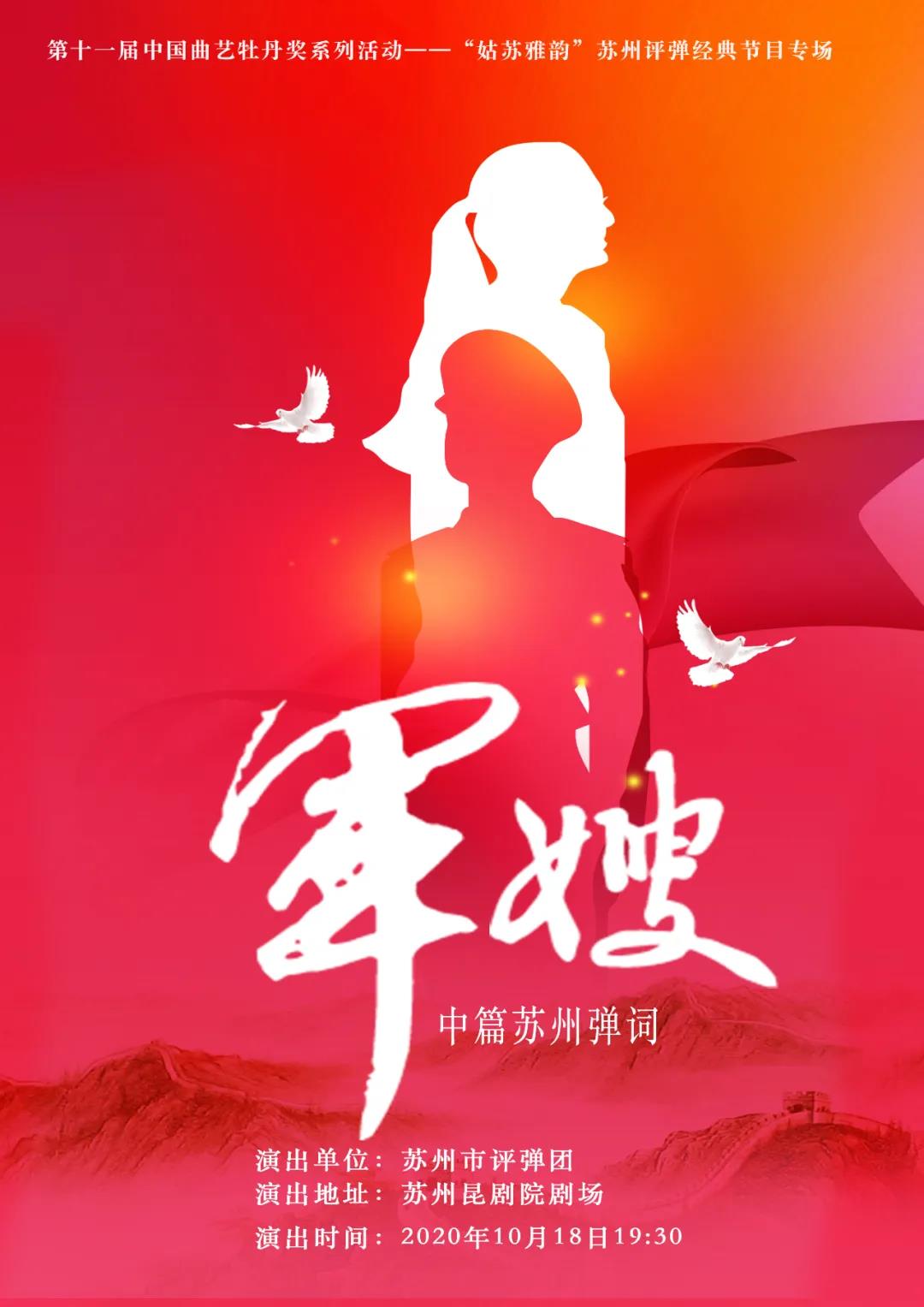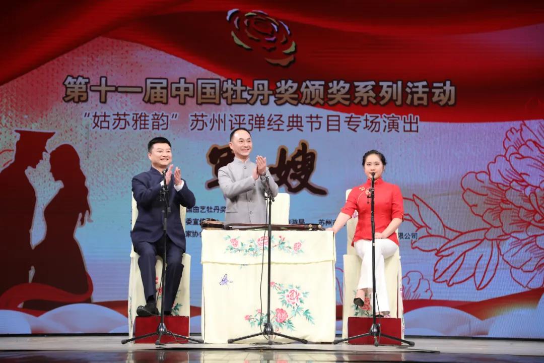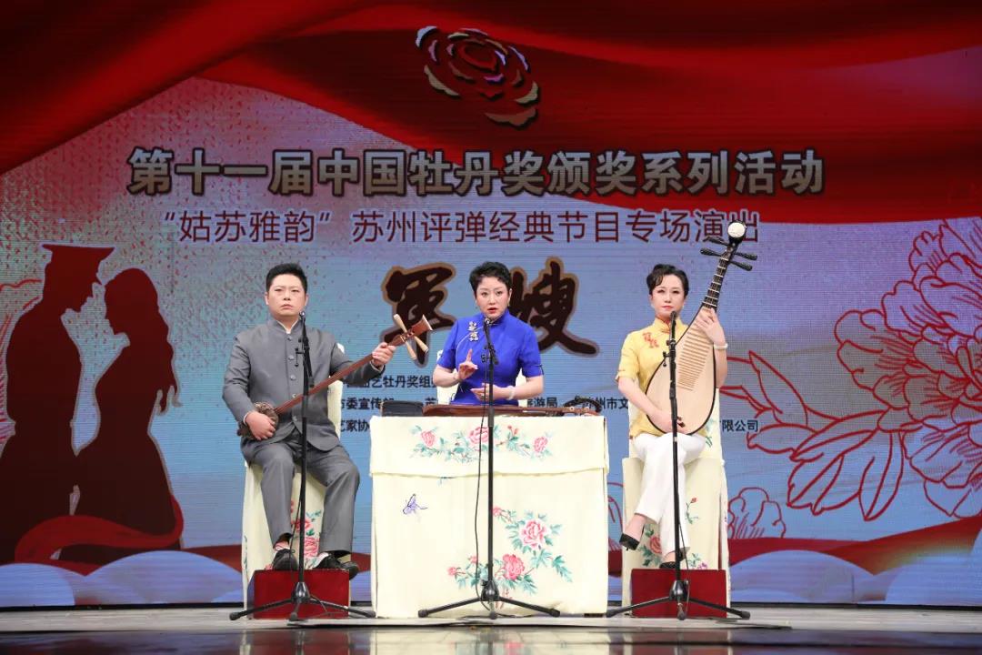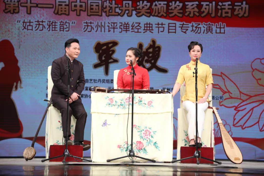 18日晚,由第十一届中国曲艺牡丹奖组委会主办,中共苏州市委宣传部,苏州市文化广电和旅游局,苏州市文联承办,苏州市曲协,江苏省苏州昆剧院,苏州市评弹团,苏州市锡剧团有限公司协办的第十一届中国曲艺牡丹奖颁奖系列活动之十五——“姑苏雅韵”苏州评弹经典节目专场演出在苏州昆剧院剧场进行,上演了由苏州市评弹团表演的中篇苏州弹词《军嫂》,该剧摘得本届牡丹奖节目奖。