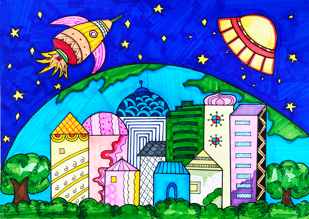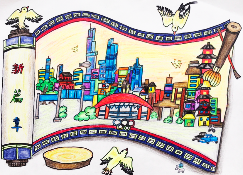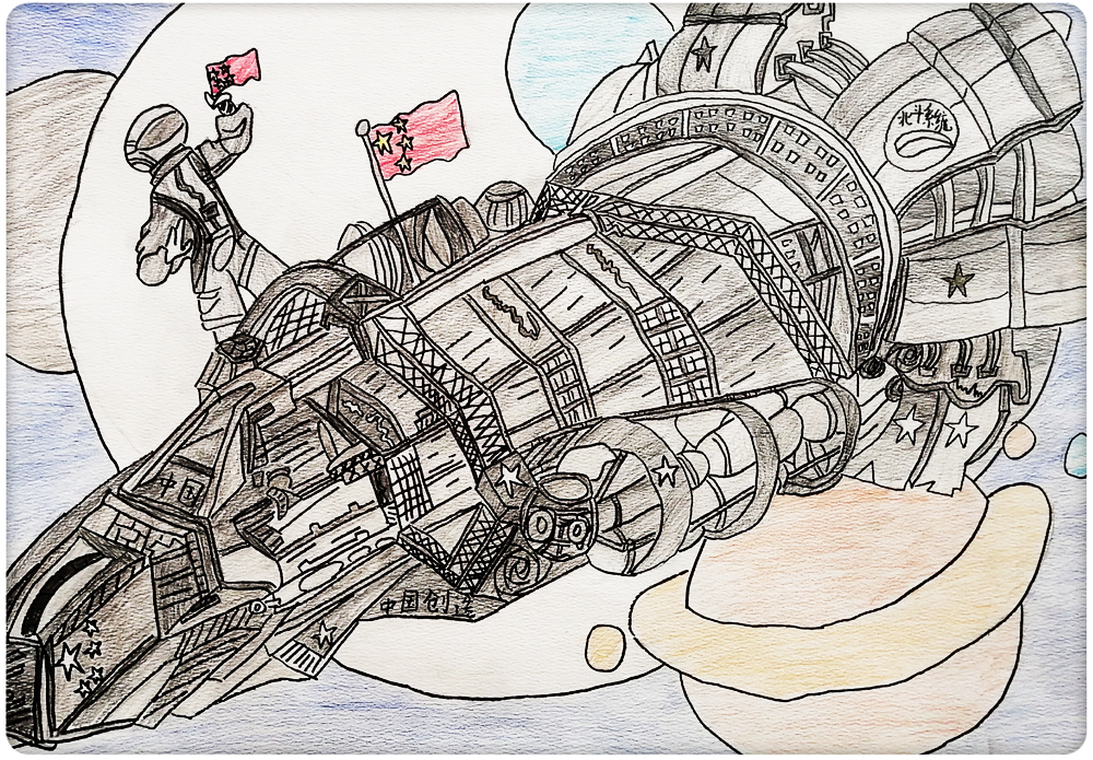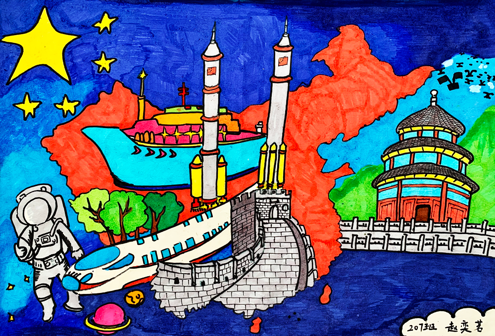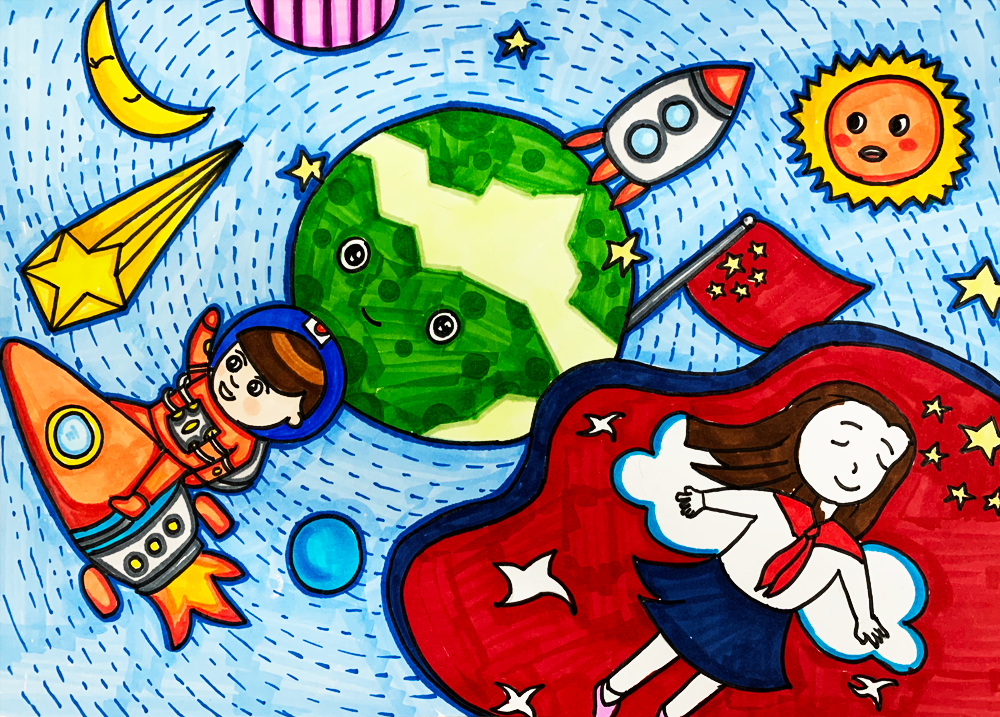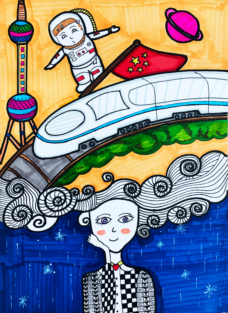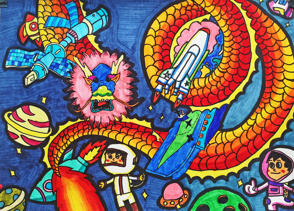 作品介绍:飞速发展的新时代,科技日新月异,我对祖国的日渐强大感到无比自豪。作品以一条腾飞的中国龙代表中国;以宇航员、火箭、宇宙飞船、航母等标志物代表中国新时代的科技发展;以地球、星辰、海洋代表中国科技的发展领域。我带着自豪的心情完成了这件作品,表达了自己对祖国和对新时代美好生活的热爱。