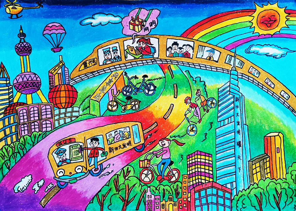 作品介绍:新中国,新江苏,新四大发明耀天下。高铁贯穿南北东西,共享单车绿色环保,网购、网络支付方便快捷。我的祖国更强大,我的家乡更美好!
