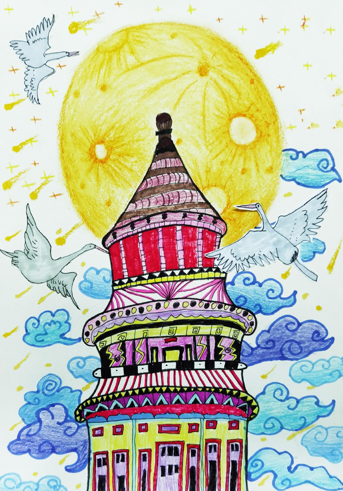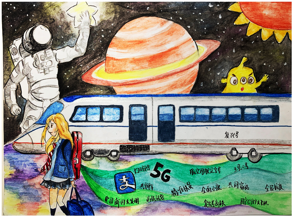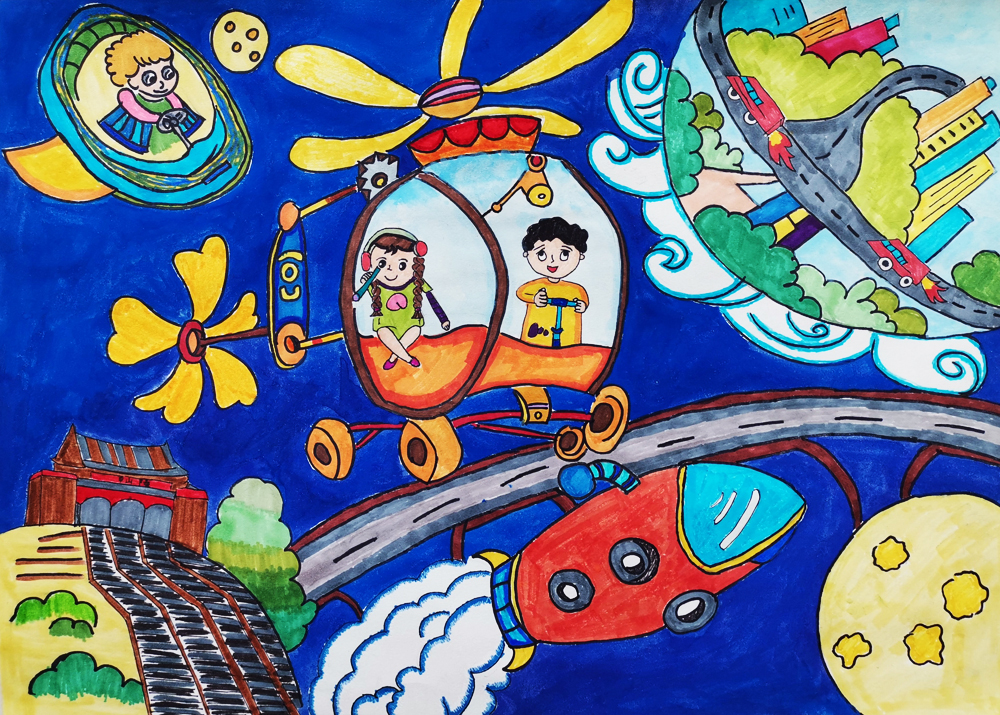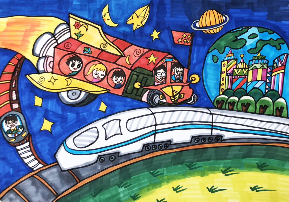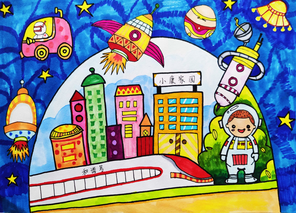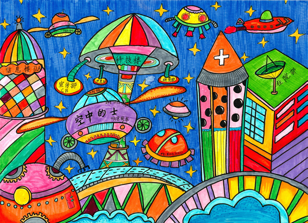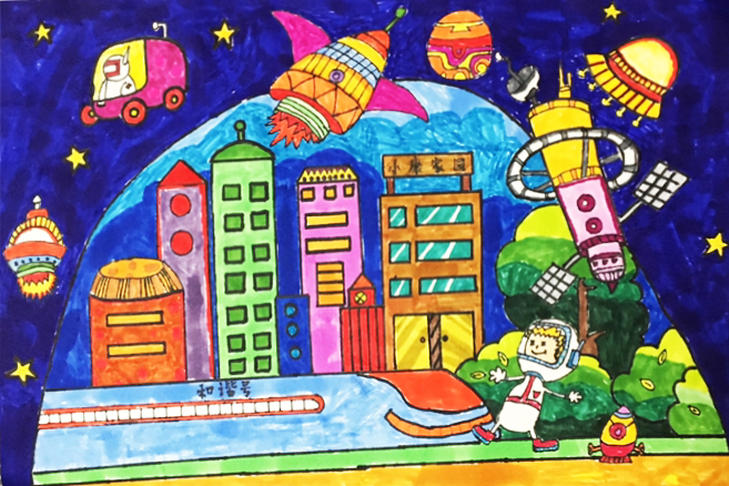 作品介绍:我想建座星空科技城,在宇宙里和星星作伴,那里有空中的士、科技研发大楼、智能化医院,人们再也不用害怕病毒了。