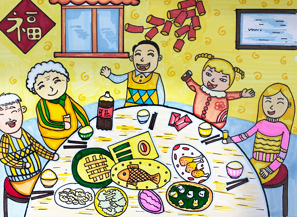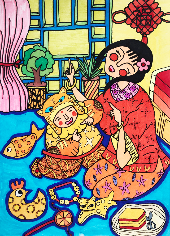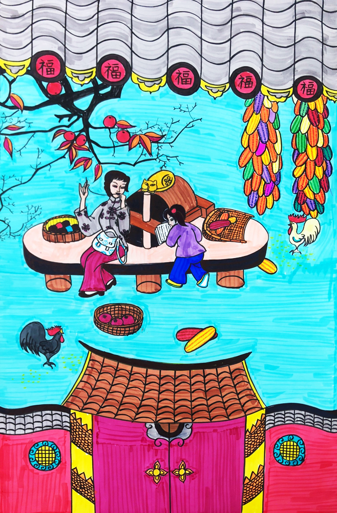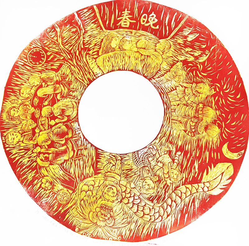 作品介绍:这幅作品中,我用木刻手法和最具中国特色的红色来表现节日的喜庆,把春节的几个风俗习惯场景串联,组成一个大大的圆,既表现了这个传统节日随着时代进步所展现的改变,也表达了我对团圆的美好期待。