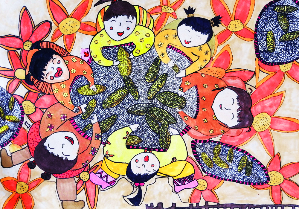 作品介绍:每年的假期都会去外婆家剥玉米,最让我开心的是能和小伙伴们围着一个大大的簸箕,一边剥玉米一边开心地说着自己在学校有趣的事情,不知不觉玉米也很快的剥完了,外婆都夸我们手脚麻利呢。
