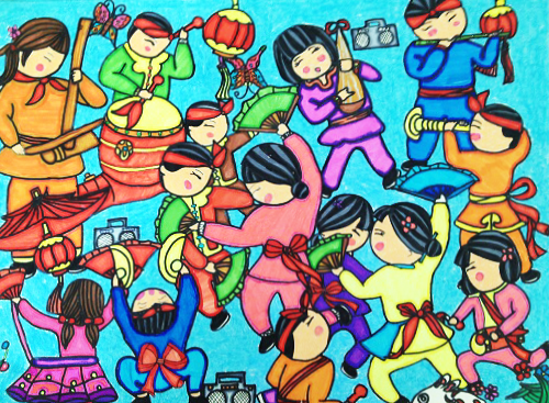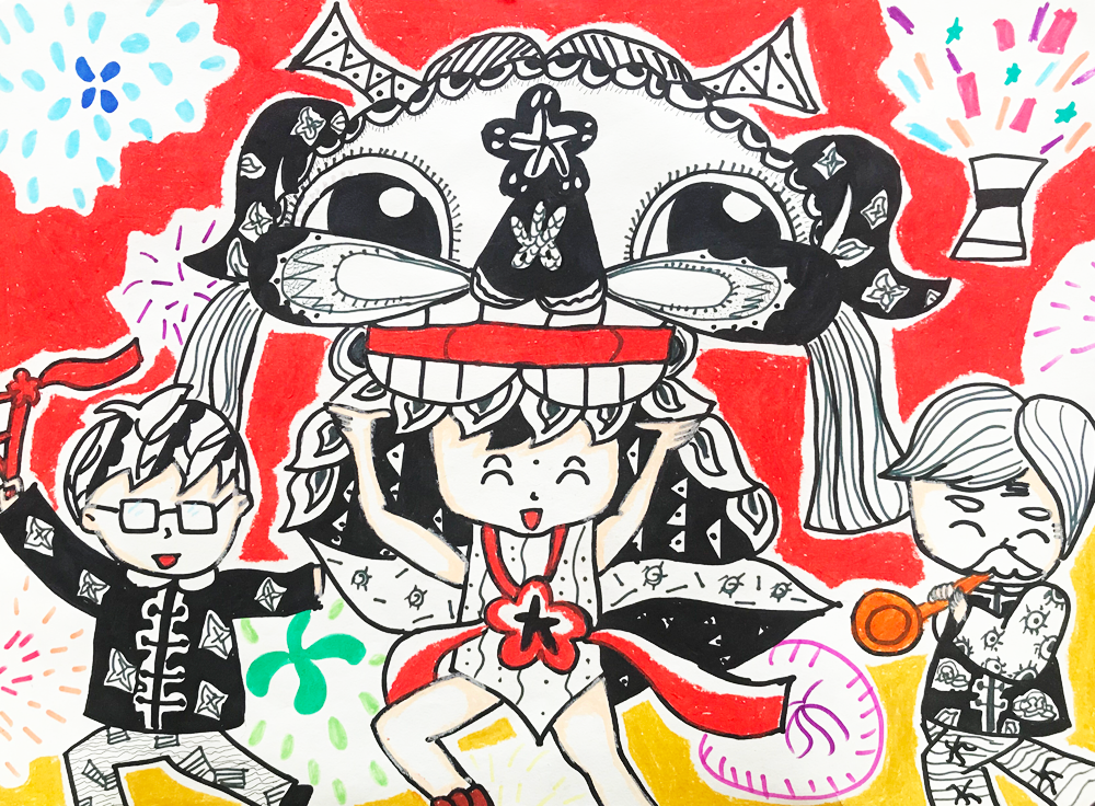 作品介绍:画面中小朋友开心地舞狮,背景用绚丽的烟花点缀,大片的红色冲击着人物视觉,画面整体运用线描和色彩相结合的形式表现,使整幅画面透露着欢庆之感。
