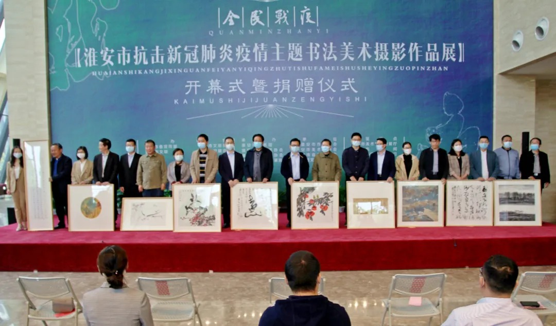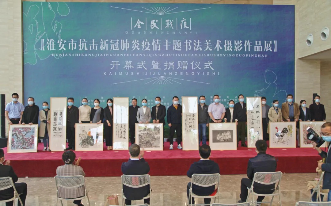 5月10日上午,淮安市“全民战疫”主题书法美术摄影作品展开幕式暨捐赠仪式在市美术馆隆重举行。市委常委、市委宣传部长周毅出席并致开幕词,市政府副市长孙虎代表文艺界向抗疫一线白衣勇士和医疗防护单位捐赠文艺作品、市卫健委主任孙邦贵接受捐赠,20位我市著名书画家向20位抗疫白衣勇士代表现场捐赠个人作品,文艺家代表翟明帅、援助武汉医护人员代表陈亮分别作了发言。市委常委、市委宣传部长周毅,市人大副主任李冰,市政府副市长孙虎,市委宣传部副部长、市新闻出版局局长杨静,市文广旅游局局长张冲林,市卫健委主任孙邦贵为展览揭幕。市文联党组书记、主席张益民主持仪式。