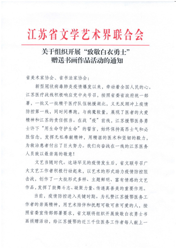 同饮一江水,苏鄂一线牵。当前,江苏已经派出了近三千名医务工作者驰援湖北,他们的一举一动时刻牵动着后方江苏儿女的心。笔墨当随时代,艺术应为人民。省文联会同省卫健委等单位举办“致敬白衣勇士”书画作品赠送活动,向重点承担援助湖北战疫任务和省内定点医疗救治任务的7家医院以及全体援鄂医务工作者赠送书画作品。