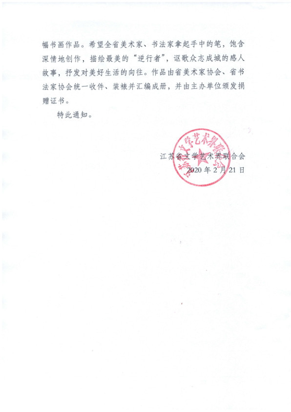 接下来,江苏省文联还将向江苏援鄂医务工作者每人赠送一幅书画作品。江苏省文联于2月21日发出通知,要求省美协、省书协组织国家级会员创作书画作品,献给江苏援鄂的近3000名医务工作者,为每一位最美“逆行者”赠送一幅书画作品。目前创作征集活动已面向全省书画工作者全面展开。