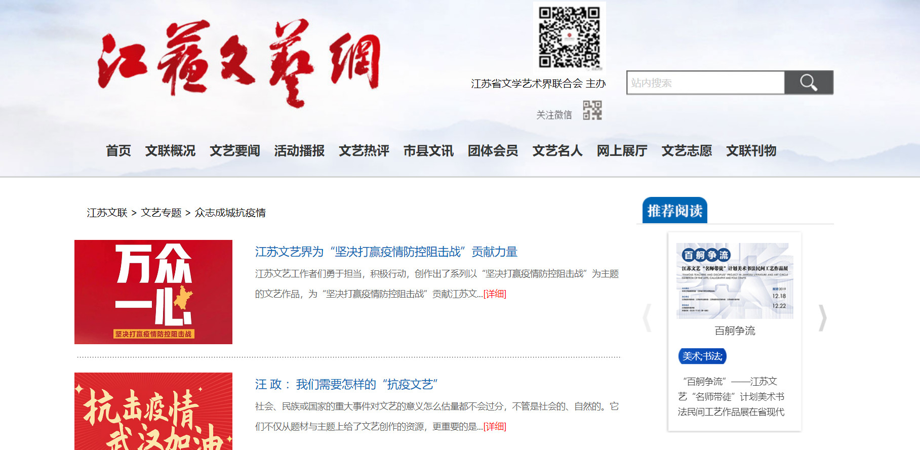 “抗疫”特殊时期,移动传媒成为文艺作品传播的主阵地。江苏省文联主动向江苏卫视、新华日报、交汇点等省内主流媒体供稿,推动电视、广播、网络、公众号等宣传形式全面出击,第一时间将文艺作品向社会广泛传播。通过江苏文艺网、江苏省文联微信公众平台、全省13个设区市文联和省各文艺家协会微信公众平台、网站,以及各大主流网站和APP,让“抗疫”文艺走向“云端”,营造众志成城抗疫情、凝心聚力克时艰的浓厚氛围。