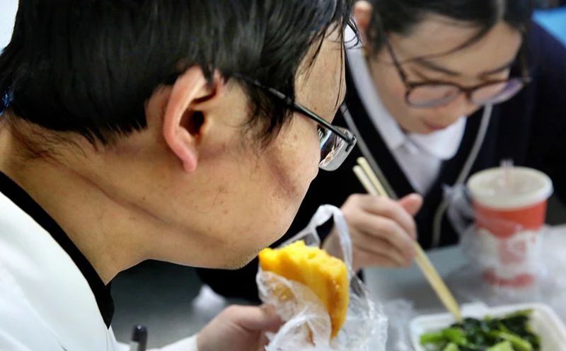 王彩医生在发热门诊夜班15小时后吃饭时,脱下防护眼罩皮肤被勒的道道伤痕。