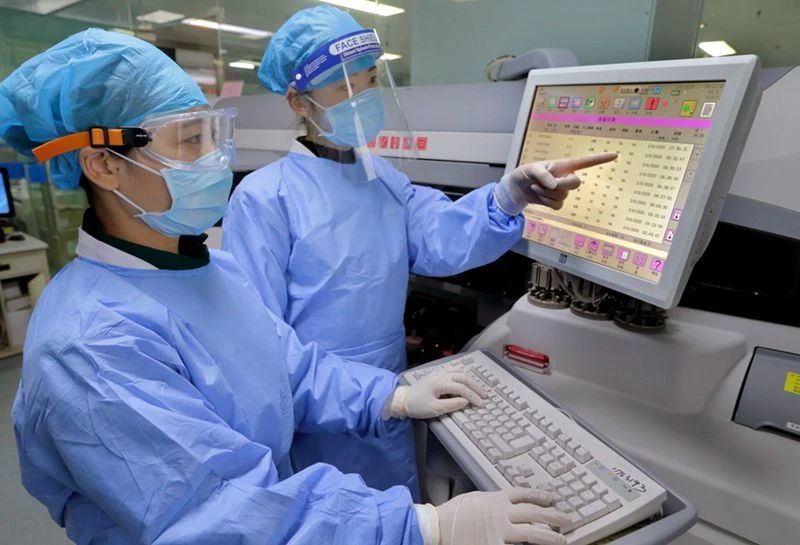 检验师冯小娟(左—)和同事正在查看血样检测结果。