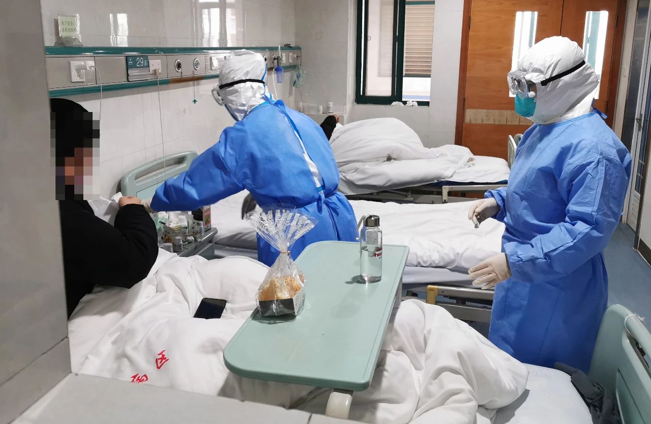 护士正在隔离病房中照顾患者吃药、吃饭。