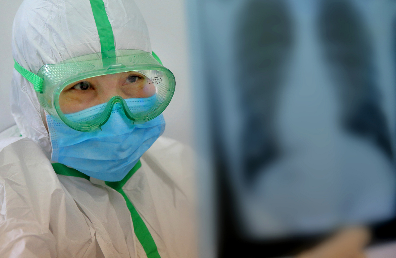 发热门诊关亦兵医生查看发热患者X光报告结果。