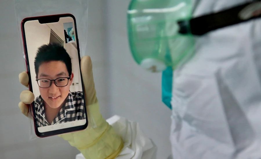 张亚利医生在发热门诊值班8天没有回家,接诊处理好病人后间隙和儿子视频。