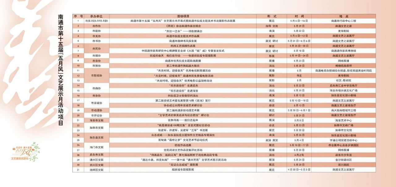 “五月风”文艺展示月是市委宣传部和市文联精心打造的文艺活动品牌,自2006年创办以来,共举办了500多项内容丰富、形式多样的文艺活动,在省内外产生了一定的影响,受到广大市民的欢迎和喜爱。本届“五月风”紧扣抗击新冠肺炎疫情主题,牵手14个文艺家协会、8个县(市)区文联,联袂推出31项精彩的文艺活动,荟萃抗疫作品展览12场、展演9场、文艺惠民服务6场、学术研讨3场等,整体联动,汇聚成一股强势的“五月风”劲吹江海大地。
