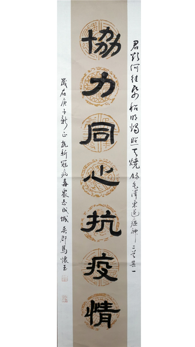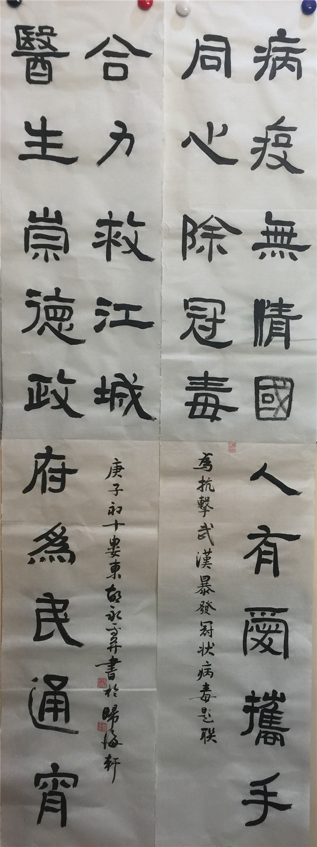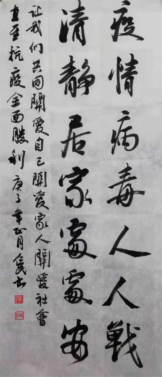 “病疫无情,国人有爱,携手同心除冠毒;医生崇德,政府为民,通宵合力救江城。”这副由太仓联人胡永平创作的联墨作品,第一时间在某网络媒体平台展示。与此同时,太仓楹联学会众多联人奋笔疾书。仅一周时间,共有68人次创作各类抗击新冠肺炎疫情的诗联作品百余副(首),通过各个渠道对外发布,勉励一线抗疫工作者和普通人民群众,同心合力、共战疫情,充分体现了太仓联人献爱心、有责任、敢担当的胸襟。