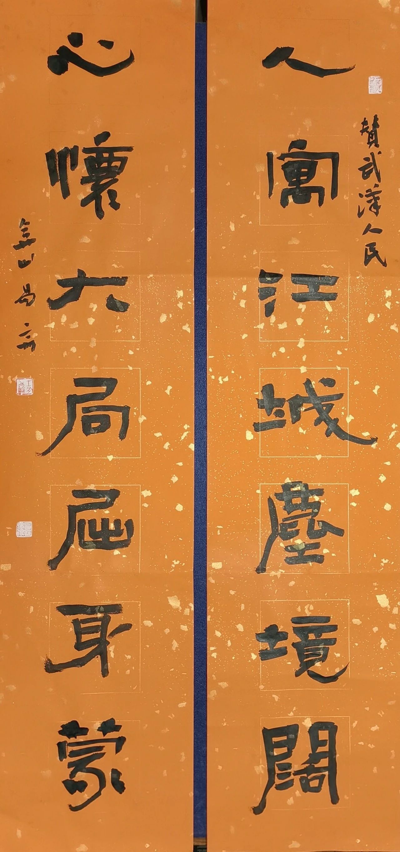 隶书七言联(语出《赞武汉全城大合唱》诗,朱永兴先生撰),王伟林书