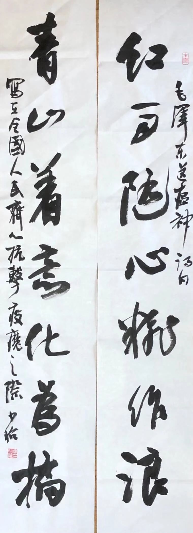 行书七言联 红雨随心翻作浪,青山着意化为桥 毛泽东诗句 张少怡书