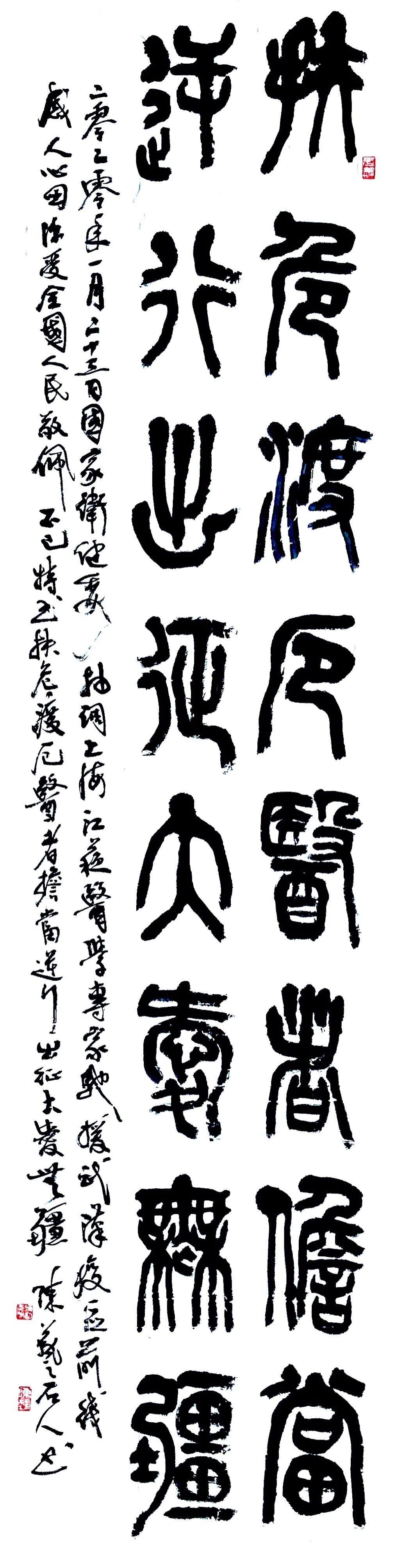篆书条幅 释文:扶危渡厄医者担当 逆行出征大爱无疆 陈 艺书