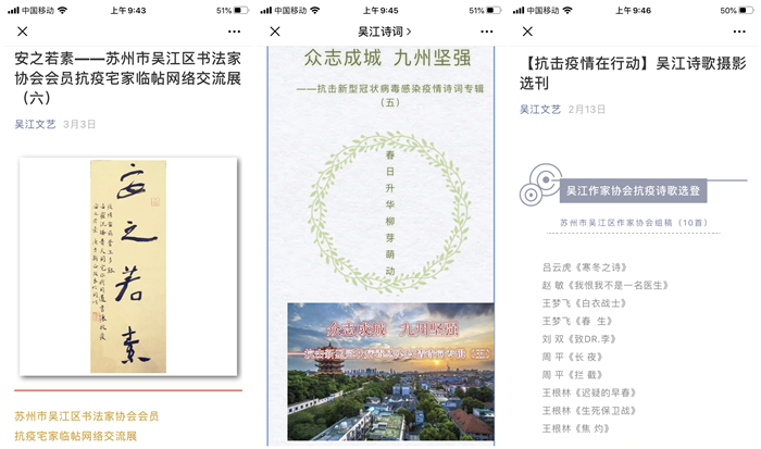 各协会通过网络,发布创作倡议,号召会员积极创作,共收到近800件各类文艺作品,吴江文艺抗疫情、吴江作家“抗疫”文学作品选、抗击新型冠状病毒感染疫情诗词专辑、吴江剧协“抗疫”文化创作集锦、你我携手丹青有爱——吴江美协抗击疫情主题创作展……吴江文艺及协会微信公众号及时予以推送。