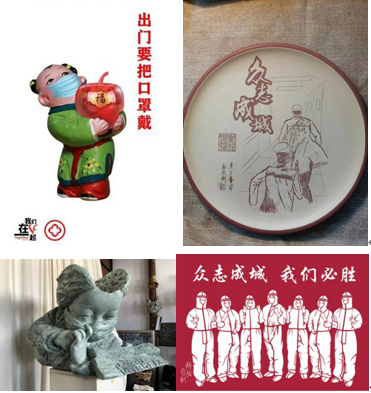 泥人宣传画《出门要把口罩戴》 陶刻作品《众志成城》雕塑《我心飞翔》 剪纸《众志成城》