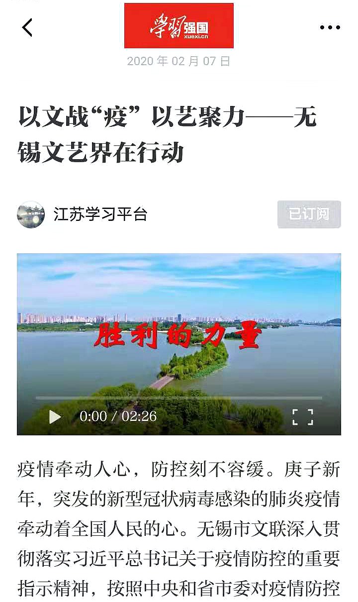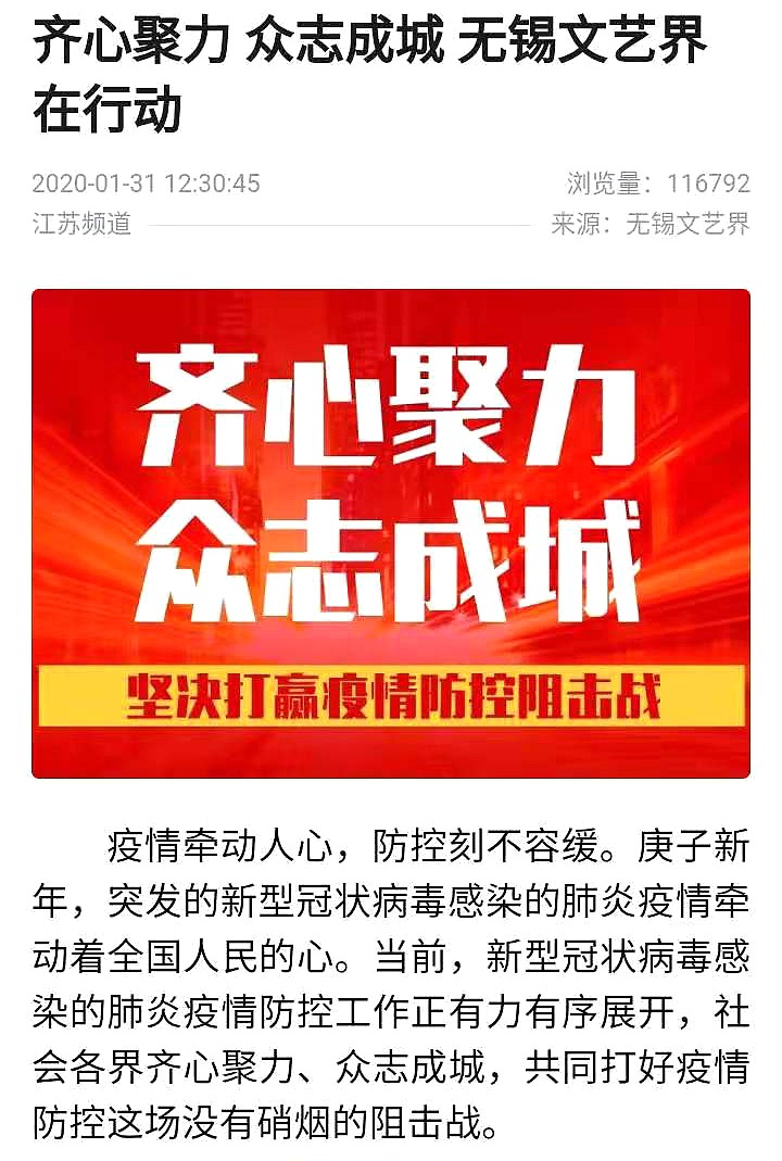 全媒体宣传。疫情发生以来,市文联利用“无锡文艺界”微信公众平台,开设《齐心聚力 众志成城——无锡文艺界在行动》专题,每天刊发系列抗击疫情主题文艺作品,截止目前,共推出了40期300多个作品。