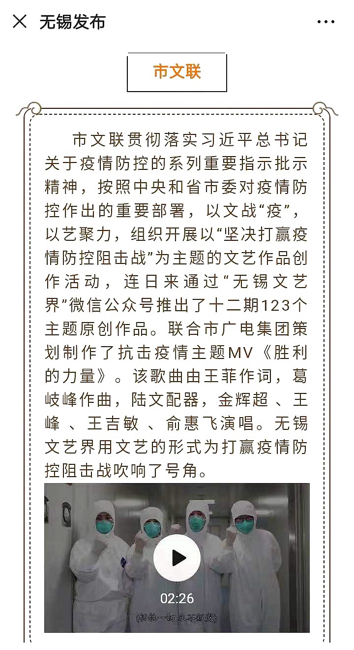 联合市广电集团策划制作了抗疫战歌《胜利的力量》MV,在《学习强国》平台播出,并同步刊发了28件反映无锡文艺界抗击疫情的优秀文艺作品.