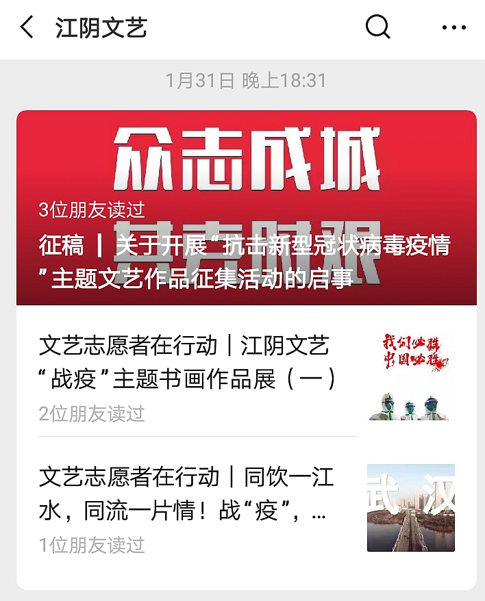 江阴市文联连续编发微信公众号48期,刊发抗击疫情主题文艺作品300多个。