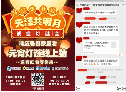 市朗诵艺术学会举行“声援抗疫——庚子元宵网络朗诵会”,分“战疫”、“致敬”、“祈祷”、“必胜”四个篇章,共计28首原创作品,并同步推送到了“喜马拉雅”网络电台,向全球传送。