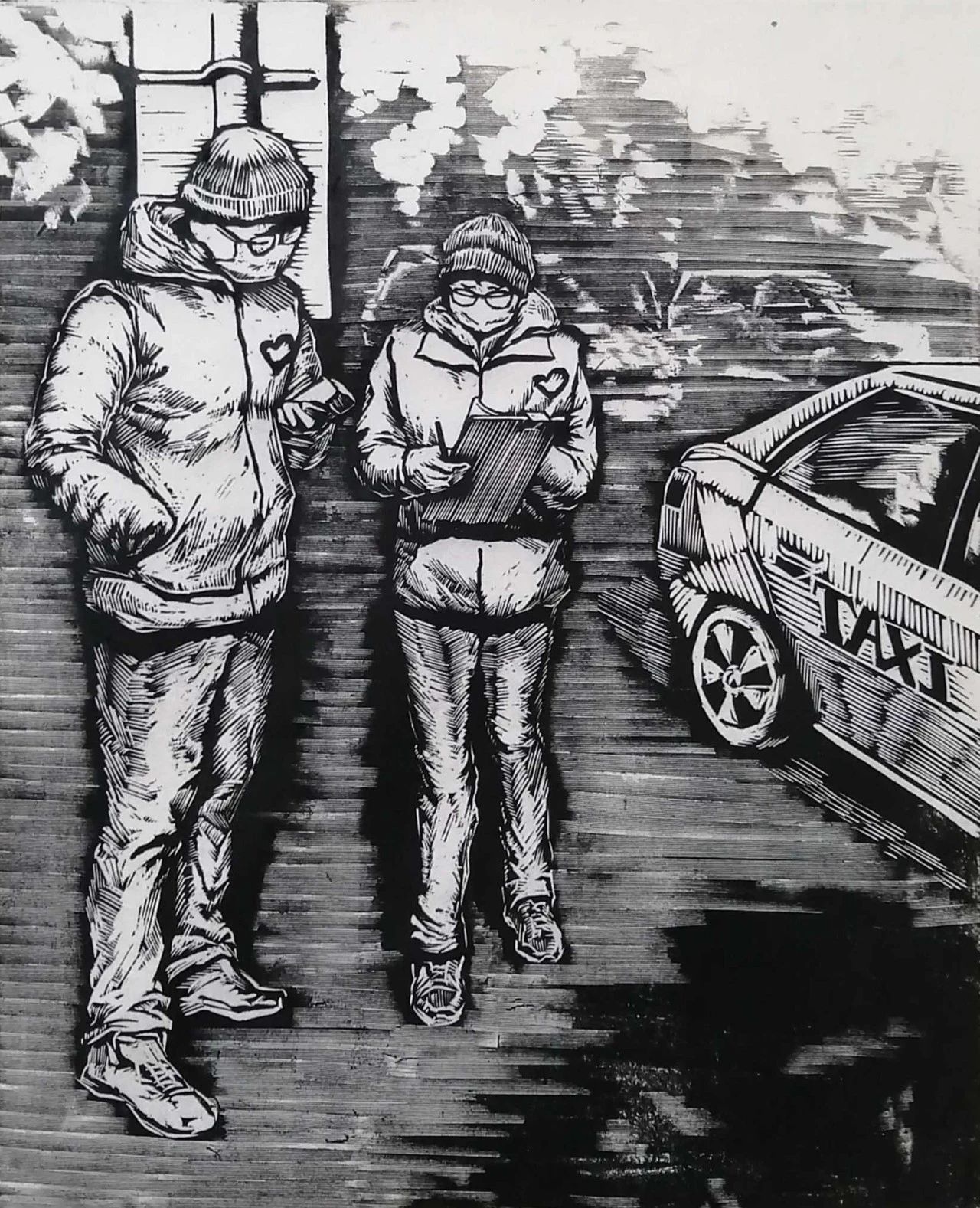 吴琼龙 黑白木刻《共同战“疫” 志愿者在路上》