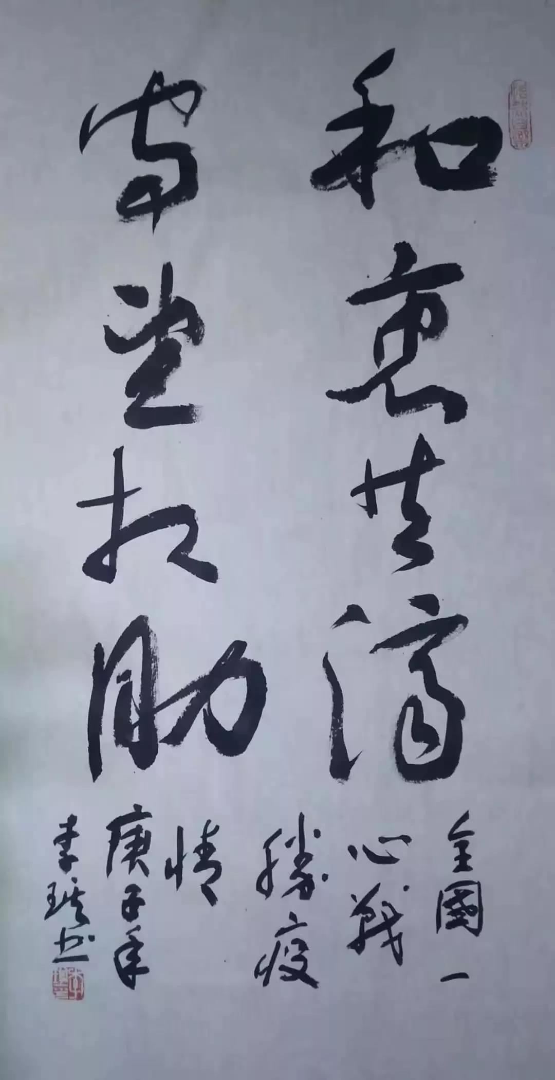 作品说明:弘毅,齐心协力,科学治疗。弘,宽广也,毅,强忍也。愿为抱薪者,携手克时艰,待到鸟语花香时,春城草木深。