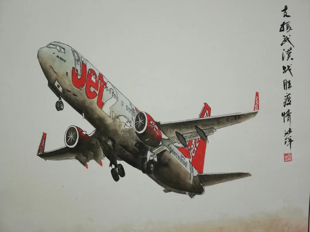 创作感言:2月13日,徐州驰援武汉医疗队从徐州观音国际机场出发,医疗队的医生护士们,为了祖国早日抗疫成功,不畏生命危险,走向了抗击新冠肺炎的第一线,我在候机楼看到这些“最美逆行者”互相鼓励、互相加油,心情凝重,泪水不由自主的向外涌出。再看到社会各界援助的医疗物资堆满飞机货仓,我又感到热血沸腾,作为一名艺术创作者,虽不能身赴一线,我也要用画笔为祖国抗击疫情贡献自己的一份力量。因此,我创作了一架架满载医疗队员和援助物资的飞机,为武汉加油!中国加油!