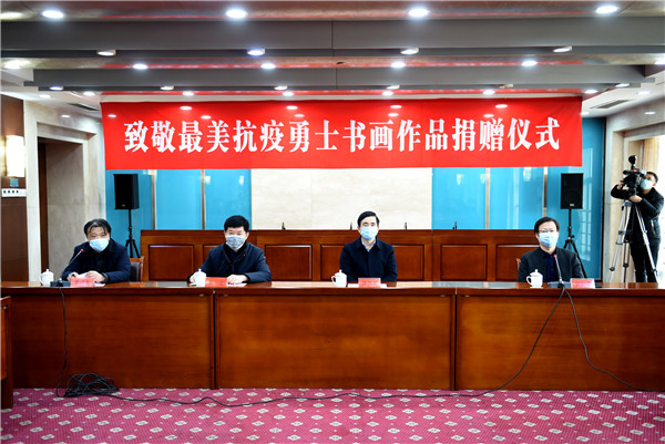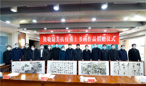 3月5日下午,市委宣传部、市文联联合主办致敬最美抗疫勇士书画作品捐赠仪式,向市一院、市二院、市中医院、市妇保院、市四院、市疾控中心、市卫生监督所、市交警支队、市环卫处、盐阜大众报报业集团、市广播电视总台、亭湖区新洋街道等12家单位捐赠书画作品。市委宣传部副部长、市新闻出版局局长薛万昌,市公安局党委委员、政治部主任王健,市卫健委党委委员、副主任徐安平,市文联党组书记、主席高定,党组成员、副主席张曙光、朱桐生,副调研员唐小荣等领导和书画家代表、接受捐赠单位代表、市文联机关工作人员、亭湖区文联负责人等30余人出席仪式。