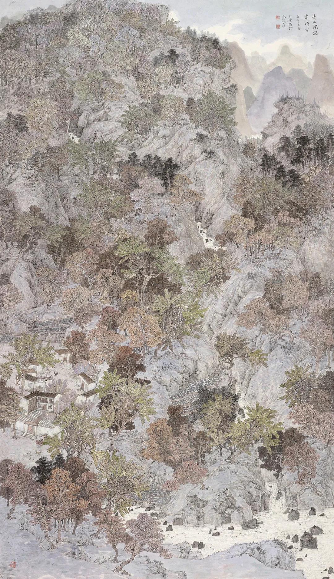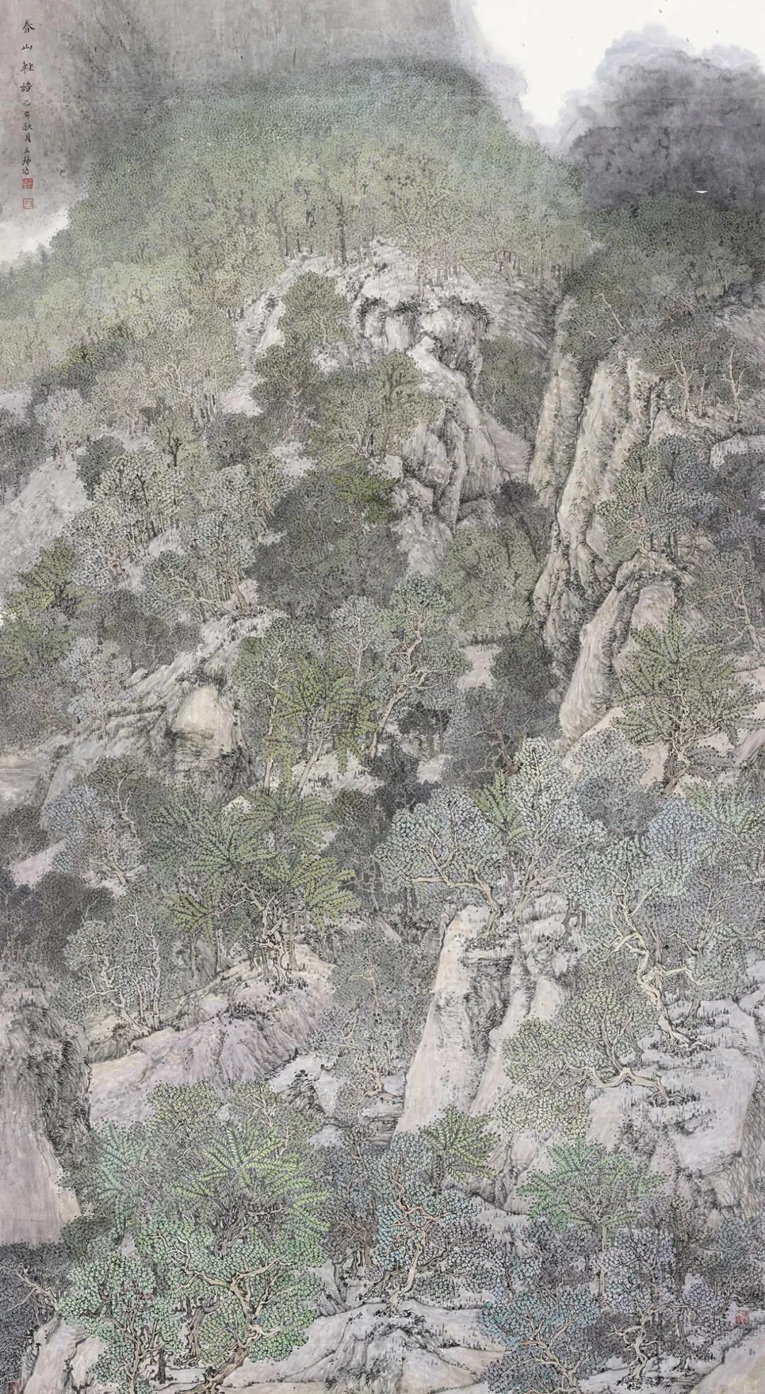 我的家乡在盱眙淮河之畔,有山有水,树木茂密,它平淡、自然,使我对家乡有着一种特殊的感情。每次徜徉在家乡的山中,总有一种莫名的幸福感,特别的温馨与亲切。因此产生了创作这幅《春山轻语》的动机。为了让作品表现出家乡充满生机盎然的春天山景。整幅画面采用了绿灰色调统领春山气氛。运用纵横交错的山体自然结构线拉紧画面结构,画面有意的加强了山体的体积塑造和树木平面化的处理来加强矛盾对比,突显画面视觉张力。使画面既能充满活力又舒缓的诗意表达。