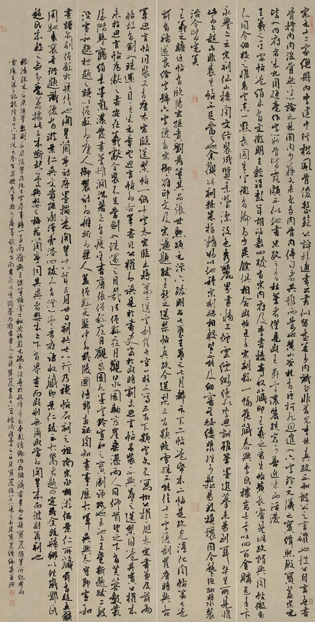这幅行书我选择清阮元《石渠随笔》部分章节作为创作的内容,在书法的取法上是以晋唐为主线的行草书,其结字以羲献为根本。起笔处多以厚重碑意切入,行笔间每以轻灵笔触空中摇曳,力求会恰魏晋之法。在整体风格的审美追求上,努力求其清逸萧散、奇趣俊朗。作品的形式采用八尺四条屏拼接而成,努力做到气韵通达。章法上左密右疏,虚实结合。