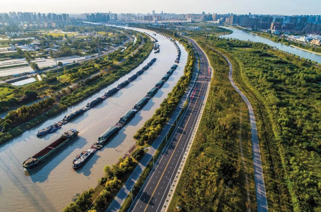 京杭大运河淮安段的运输船队。运河之都淮安在战胜新冠疫情之后,加快复工复产力度,运河恢复往日的繁忙景象。