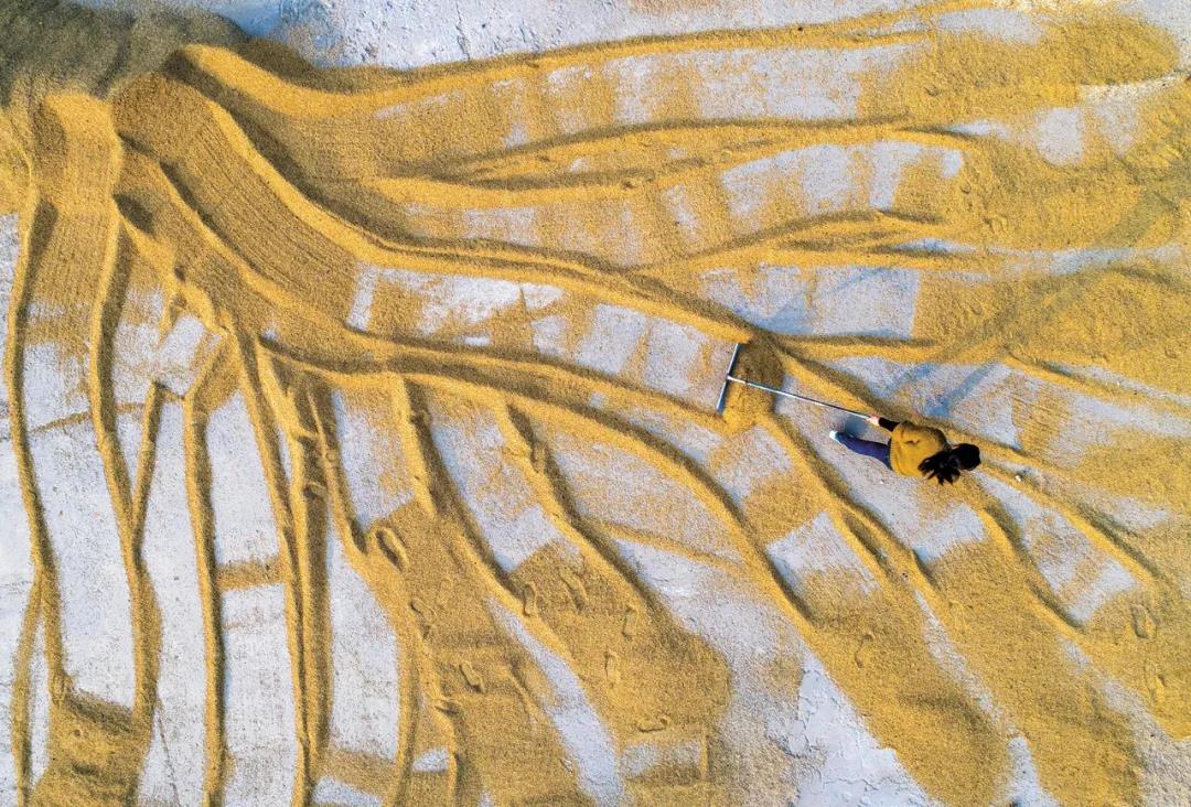 淮安市洪泽区,村民在晾晒成熟的稻谷。村民劳动的身影和稻谷自然形成的树形,给人以遐想。