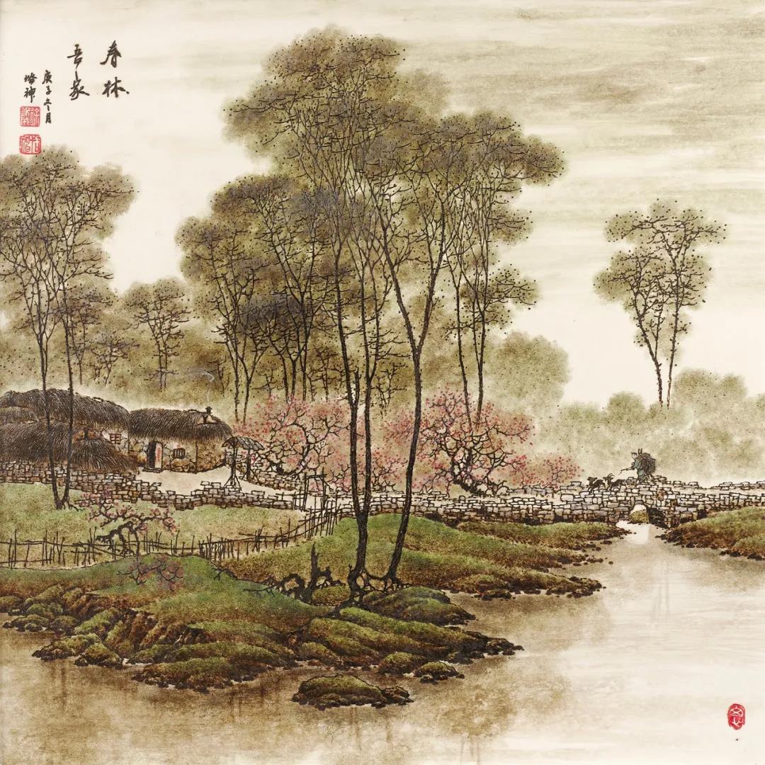 乡愁里的春天系列之春林吾家彩色烙铁画40cm×40cm